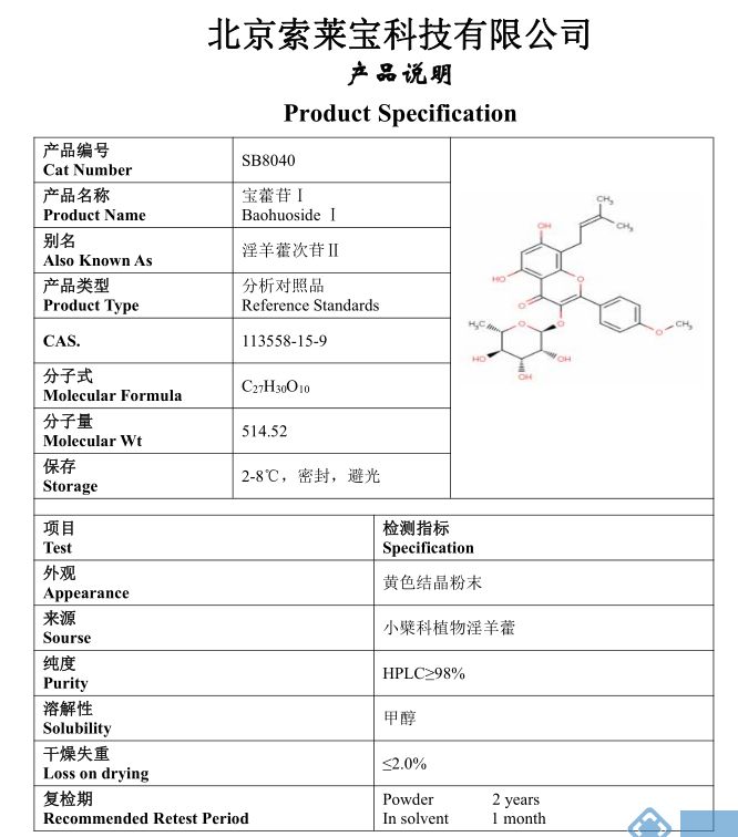产品名称: BaohuosideⅠ;宝藿苷Ⅰ
